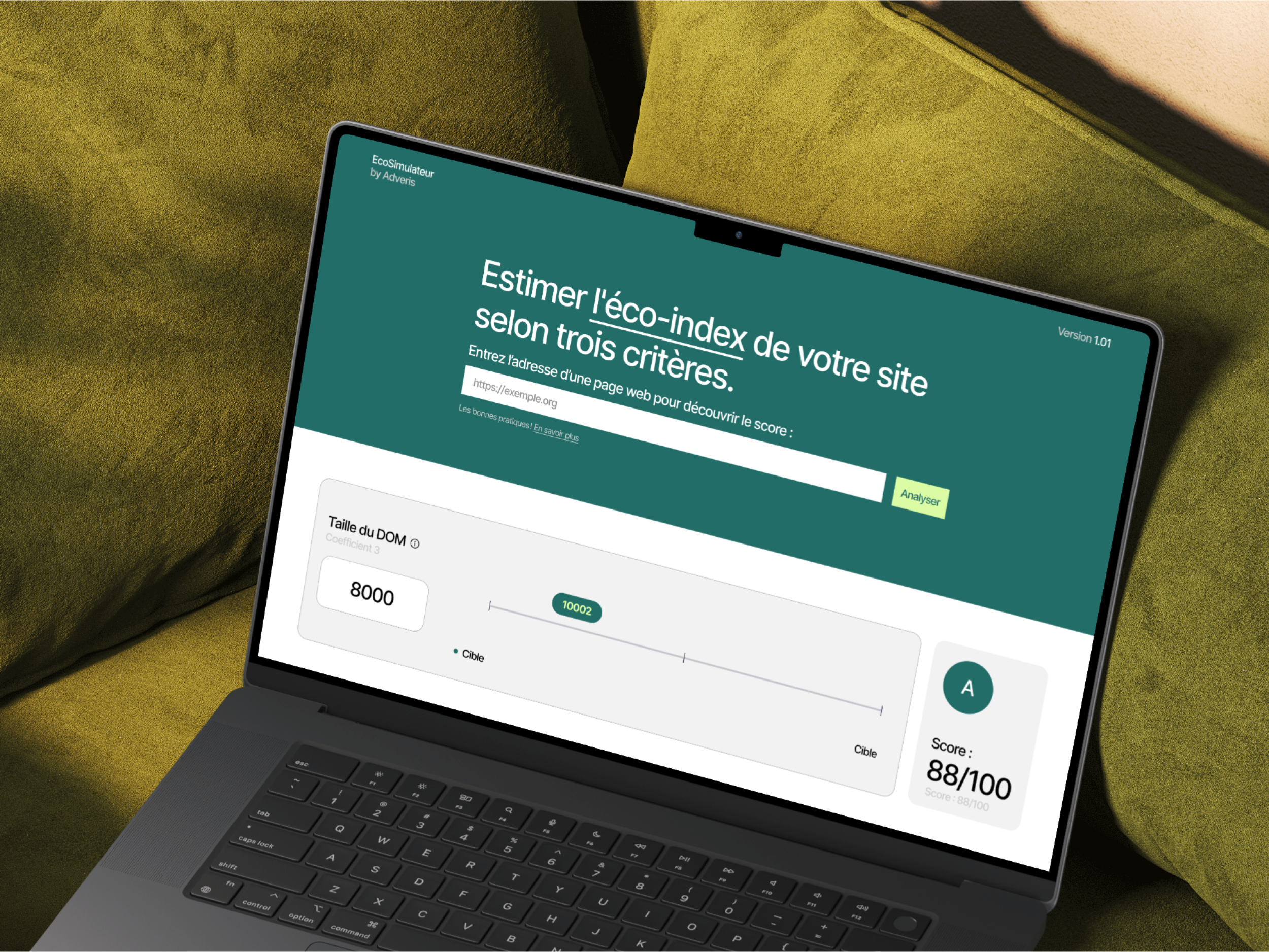 L’EcoSimulateur en ligne (eco-simulateur.adveris.io) développé par Adveris permet de simuler l’EcoIndex que vous pourriez obtenir en optimisant votre site internet. Il est fondé sur l’EcoIndex de GreenIT, score évaluant l’empreinte carbone d’un site web, qui utilise 3 critères : 1/ complexité de la page (DOM), 2/ nombre de requêtes et 3/ poids de la page.