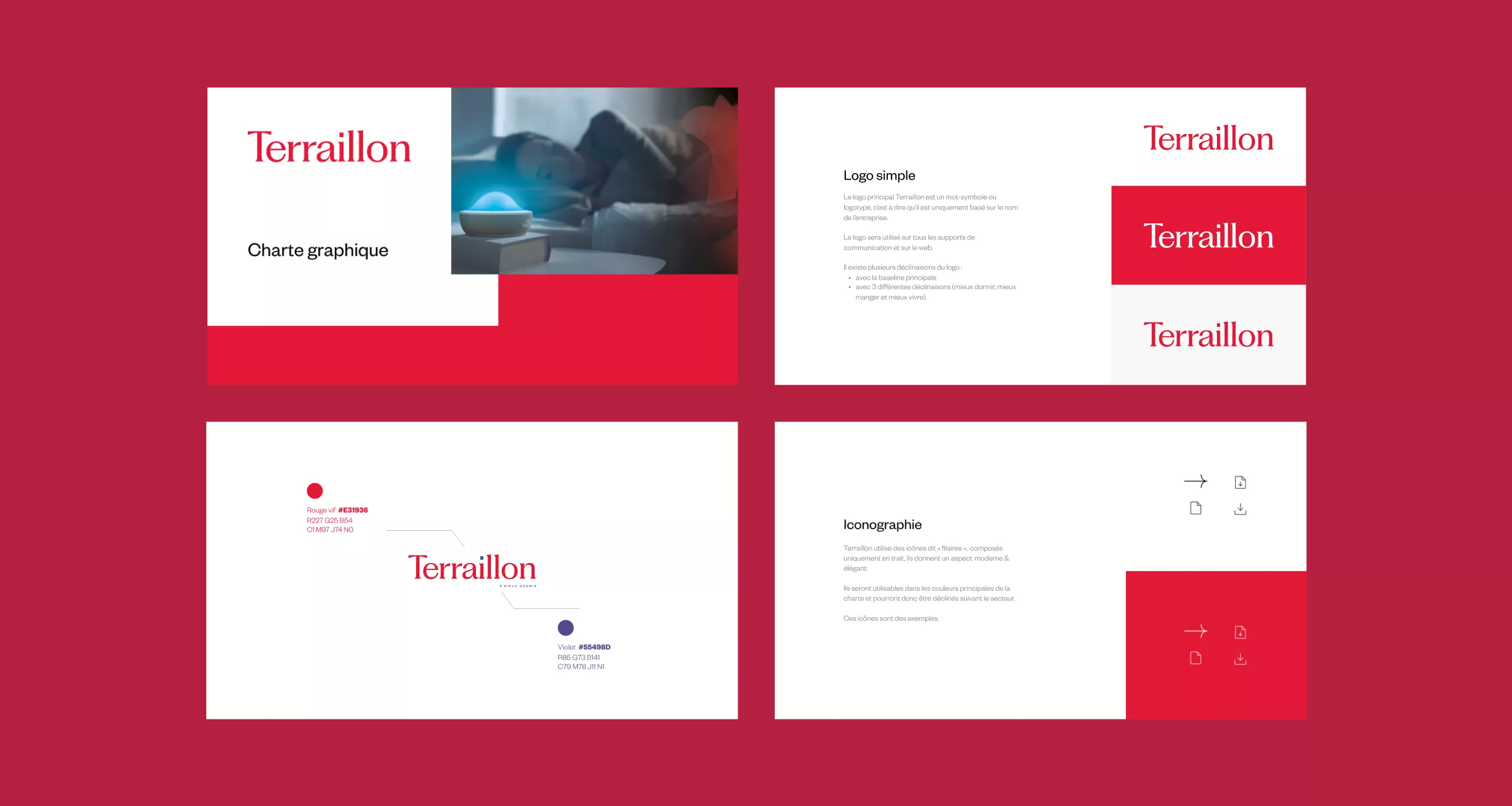 Un logo qui conserve le rouge historique en utilisant une typographie résolument plus moderne et élégante. Une baseline travaillée dans la continuité de l’ancienne. Une architecture produit pensée dans la continuité de la baseline: mieux-être, mieux dormir, mieux manger.